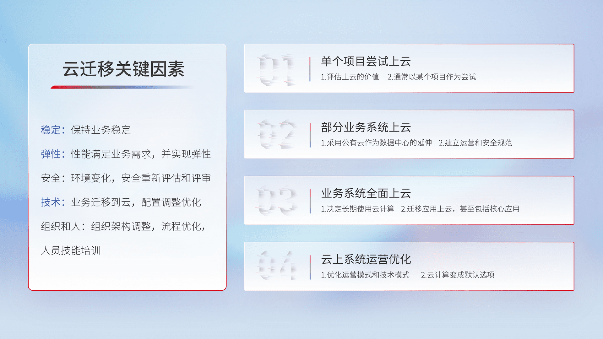 结合实际业务,,,从规划设计、、云平台选型、、、、云原生改造、、数据迁移、、集成交付,,,,迁移全过程为客户识别最佳上云路径,,,,做好风险识别管理,,,设计网络架构、、、身份权限、、、安全审计合规、、、操作审计、、、、日志审计、、、、监控告警策略、、多站点容灾设计等,,对云上基础设施进行整体规划,,提升IT治理水平,,以满足弹性、、、高可用、、、高性能的需求。。。。