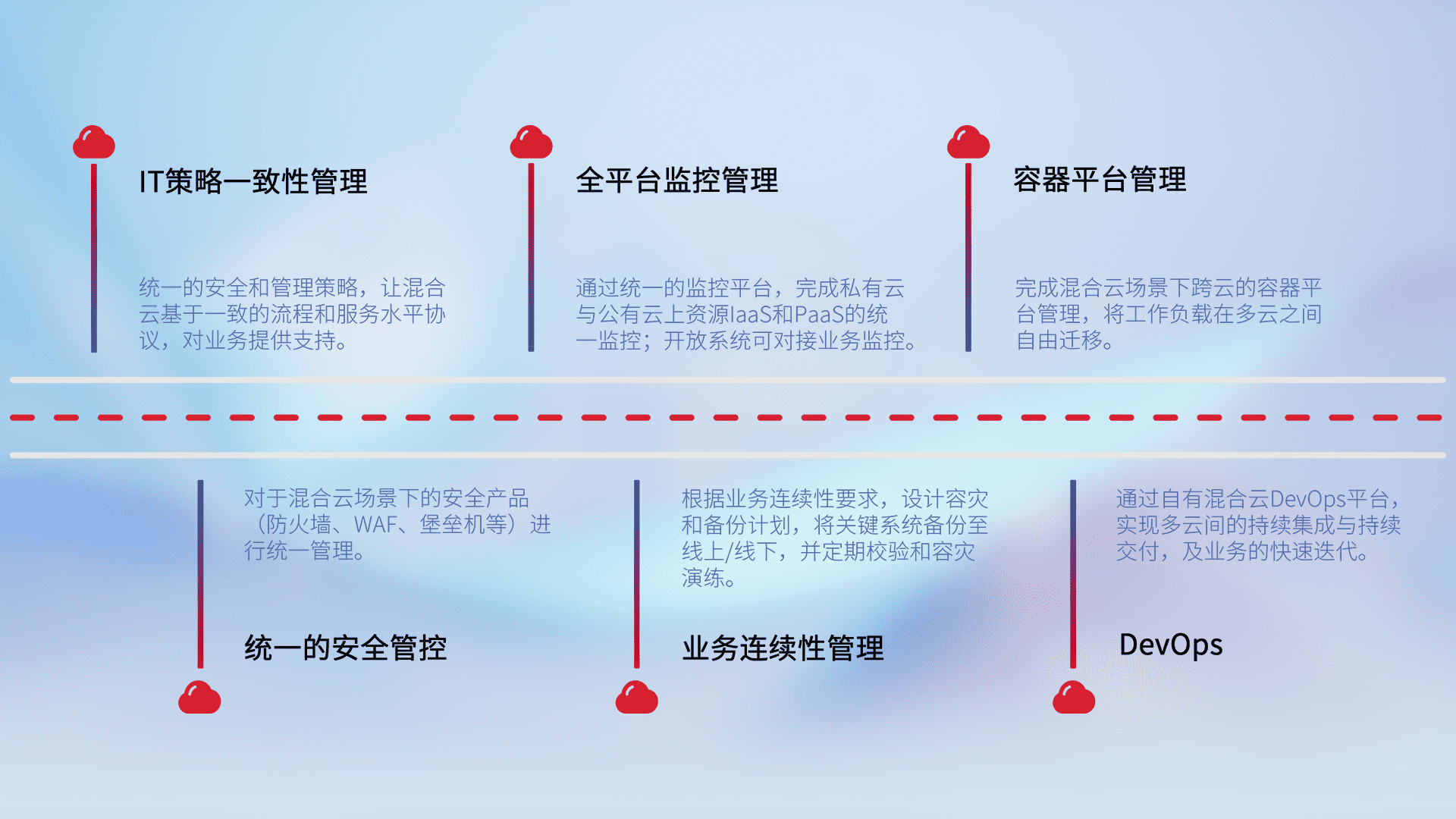 通过多云纳管,,,以统一的资源数据模型把客户的云资源进行抽象和封装,,进而实现对多云资源的统一操作,,保障云资源管理的可靠性、、、稳定性与可用性。。。量身定制化运维内容,,配置、、开发运维、、、补丁管理、、、备份、、、、监控、、、、认证和访问管理、、审计和日常巡检等,,,保障在用云过程中的可靠度,,稳定度以及高可用率。。。